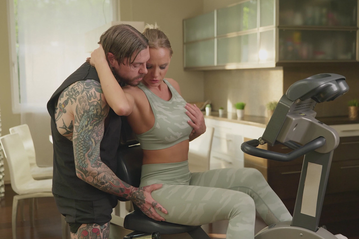 Die vollbusige Blondine Nina Heels änderte ihre Meinung, als der tätowierte Dean Van Damme den Raum betrat. Sie hat die Lust am normalen Trainingsprogramm verloren. Sie braucht etwas anderes.